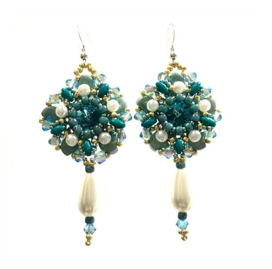 Addy Earring Pattern with Ginko Beads - Downloadable Pattern by Isabella Lam Materials Required: 10 x Ginko Beads 10 x SuperDuo Beads 40 x 4mm Swarovski Bicones 2 x 10mm Swarovski Rivoli 10 x 4mm Pearl Beads Seed beads in sizes 11/0, 8/0 and 15/0 2 Pearl Drop Beads Earring Findings Thread and Needle