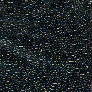 10/0 Miyuki Delica Beads – Green Iris Iris coating is an iridescent finish with multiple hues, usually applied to darker beads to maximise the beautiful effect Each bead measures 2.3mm x 1.2mm with a 1mm hole size Priced per 5 gram bag – approx 500 beads!