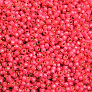 11/0 Miyuki Seed Beads/Rocailles Duracoat S/L Hot Pink Our Miyuki seed beads are sold in 25 gram bags approx 2600 beads Bead size 2mm Hole size 0.8mm Miyuki 11/0 Seed beads are used in all kinds of beadwork designs and patterns, we recommend you use a size 12 needle with size 11/0 beads.