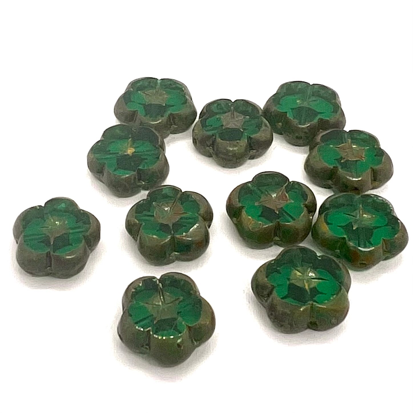 14mm Czech Glass Table Cut Flower Bead - Emerald Picasso - Per Piece