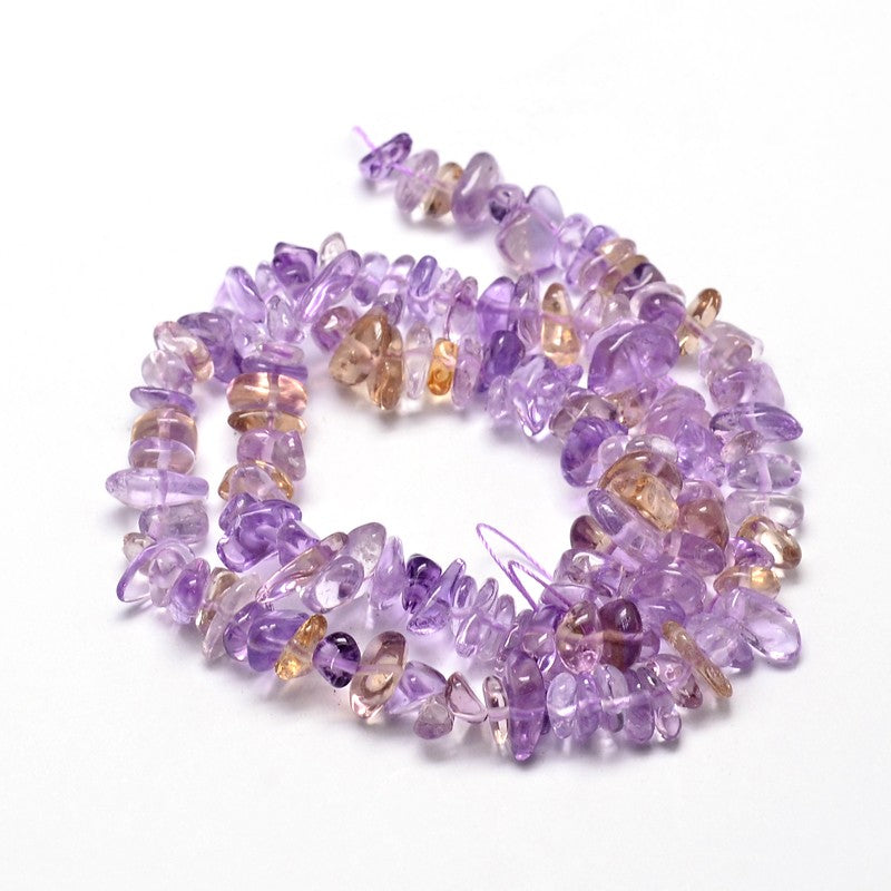 Ametrine Gemstone Chip Strand Ametrine is a wonderful blend of citrine and amethyst 15 Inch Strand Hole size.