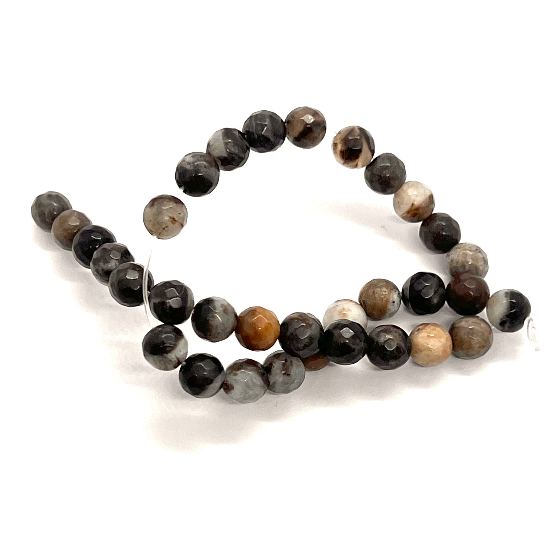 Approx 35 beads per strand Silver Leaf Jasper is mined in Madagascar at the base of the cliffs where the land meets the Indian Ocean Soft greys and charcoals with inclusions of taupe and honey tones Faceted for that little bit of sparkle Hole size 1mm Silver Leaf Jasper is said to be a very grounding stone.