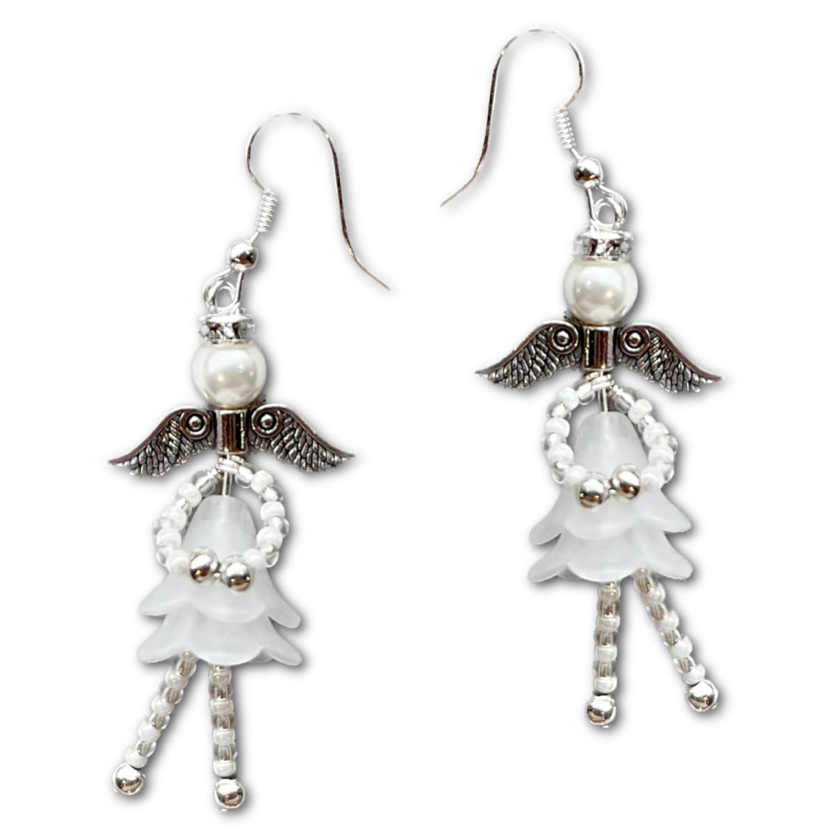 Angel Earring Kit with Miyuki seed beads, silver plated findings, czech glass pearls and crystal rondelles Kit includes all beads, instructions and silver plated findings Suitable for beginners In addition to the items in the kit you will need round nose pliers, chain nose pliers and side cutters.
