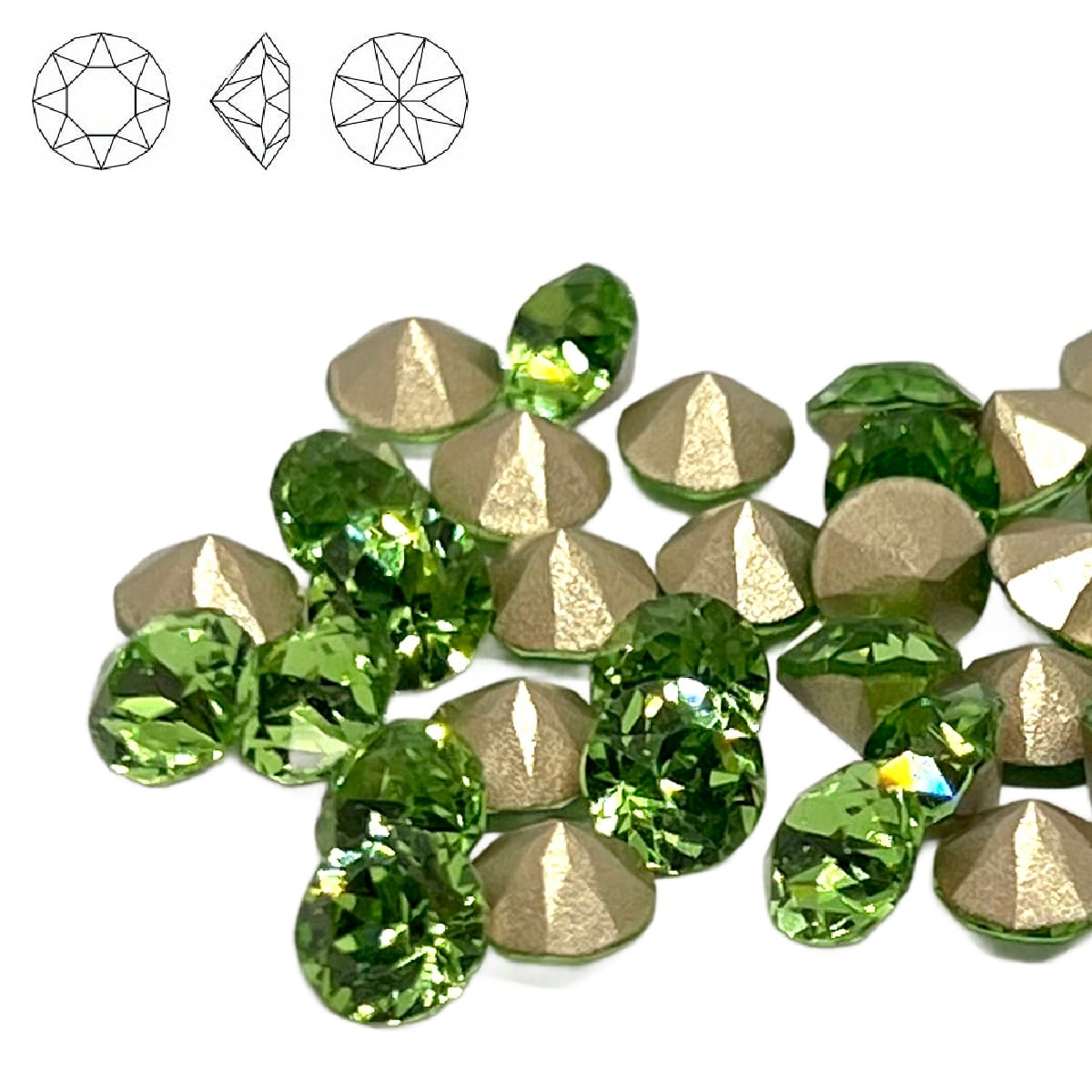 Aurora Crystal Pointy Back Chaton (C1088) SS29 Peridot Foiled for extra sparkle Ideal for beadwork designs and use with metal clay, polymer clay and resin Crystals Measure 6mm.