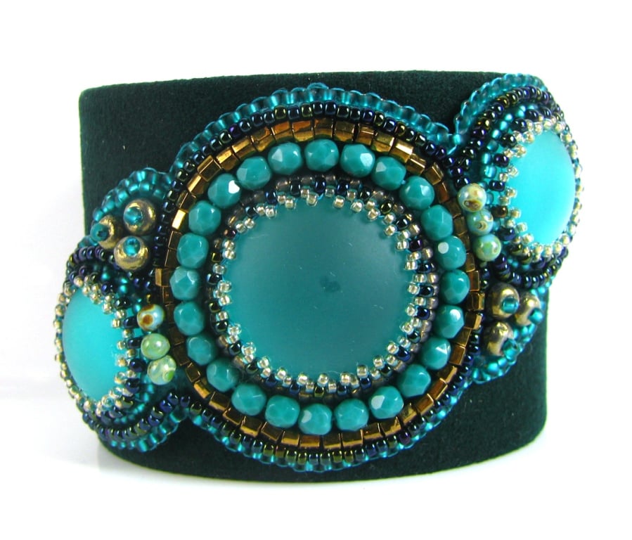 Fully illustrated instructions for how to make a bead embroidered cuff, including how to bezel a cabochon and attach it to beading foundation.