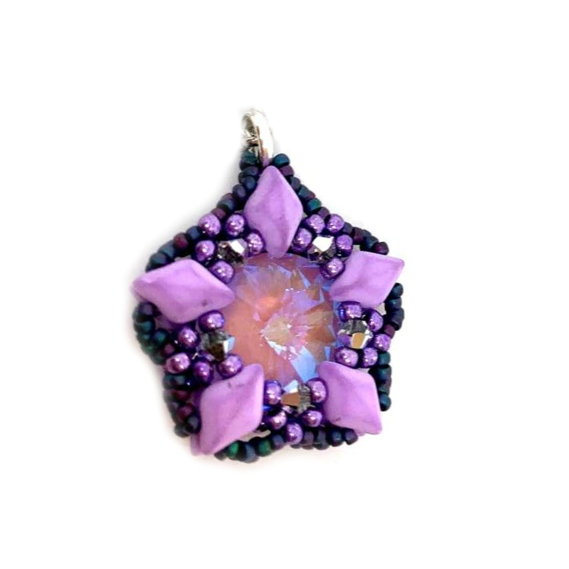 Make as a pendant, earrings or join together to make a bracelet or necklace Materials Required 14mm Rivoli 10 GemDuo Beads - 15/0 Miyuki Seed Beads - 11/0 Miyuki Seed Beads to match 15/0s 5 3mm bicones, 5 8/0 Miyuki Seed Beads to match OR 10 3mm bicones - A Closed jump ring Also thread and No12 beading needle