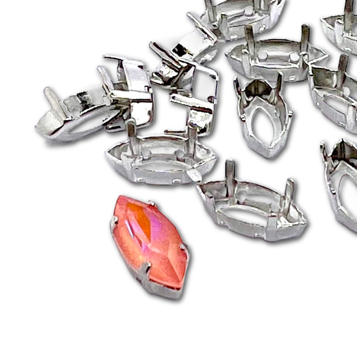 Josef Bergs Sew-on Setting Fits 15x7mm crystal navette stones 4 Prongs 4 Holes for sewing into your beadwork, onto clothing, accessories and homewares Priced per piece Josef Bergs findings have been manufactured in Germany since 1878 and are very high quality, they are nickel free and are made on a base metal of copper Use chain nose pliers to gently close up the prongs on the setting to fix your crystal securely in place