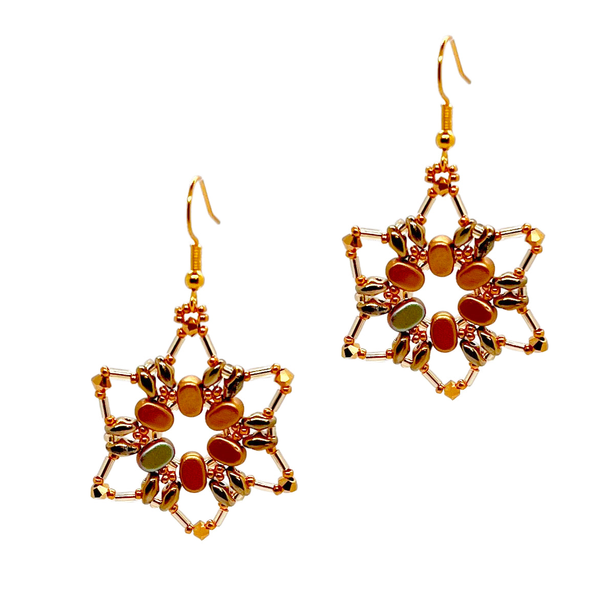 Perfect for beginners and experienced crafters alike, this kit includes everything you need (except for thread and needle) to make a dazzling accessory that will light up any outfit.**Whatโs Inside:** - High-quality gold plated findings for a professional finish. - Sparkling crystals and delicate seed beads in complementary shades to form an intricate star shape. - Easy-to-follow step-by-step photographic instructions **Why Youโll Love It:** - **Fun & Relaxing:** Enjoy the satisfaction of creating wearable art. - **Unique Design:** Your earrings will stand out with their intricate star patterns and shimmering details. - **Giftable:** Craft them for yourself or as a handmade gift for a loved one. - **Learn & Grow:** Perfect for honing jewellery-making skills or exploring a new hobby.