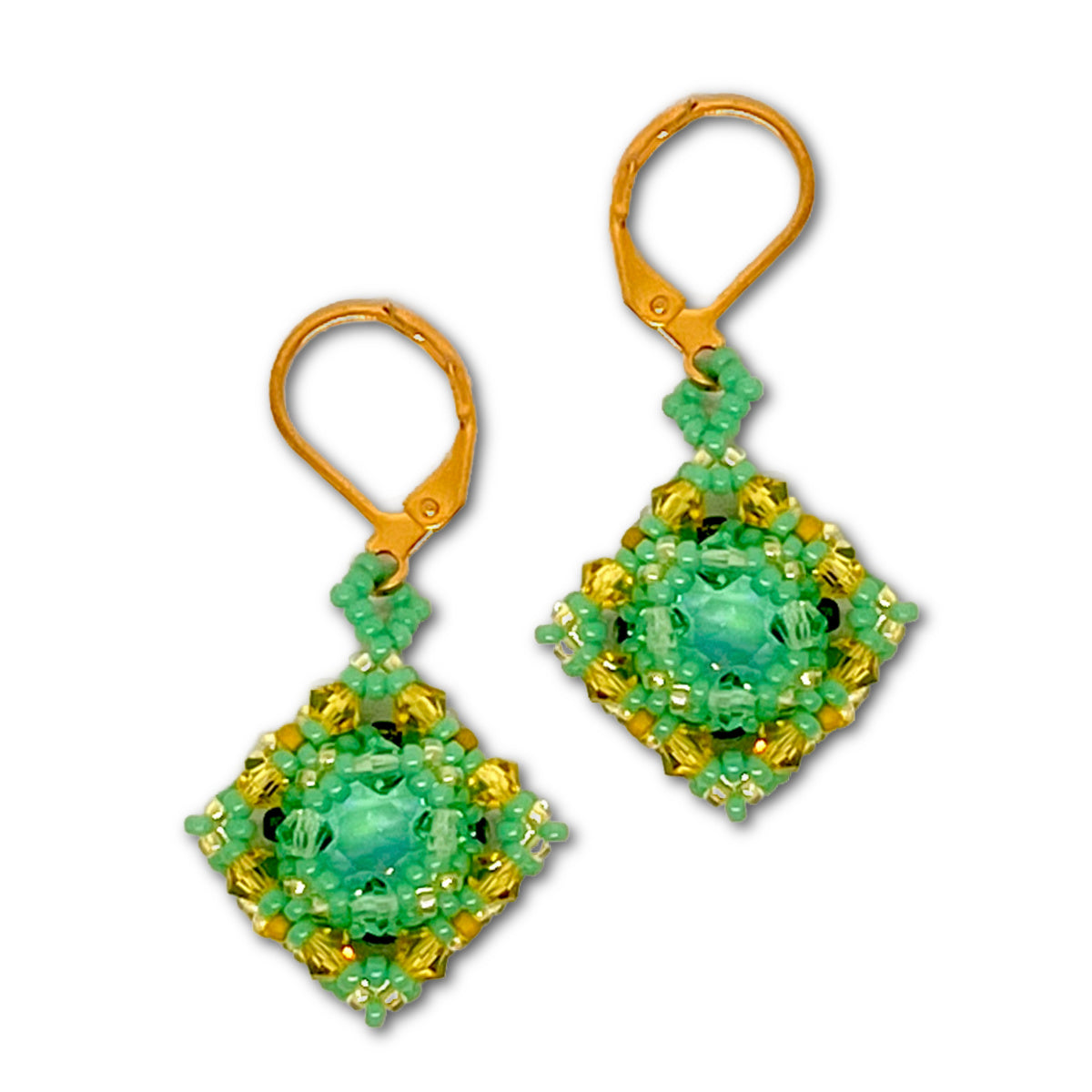 Sparkle Square Earring Kit by Ruxandra Puscas Fresh Lemon Grass Colourway Kit includes full colour instructions and all the beads and crystals needed to create a pair of earrings with gold plated findings In addition to the kit you will need a size 12 beading needle and beading thread Find more of Ruxanda's beautiful beading patterns over on Ruxandra's Esty Shop Etsy: Margiques Etsy Shop