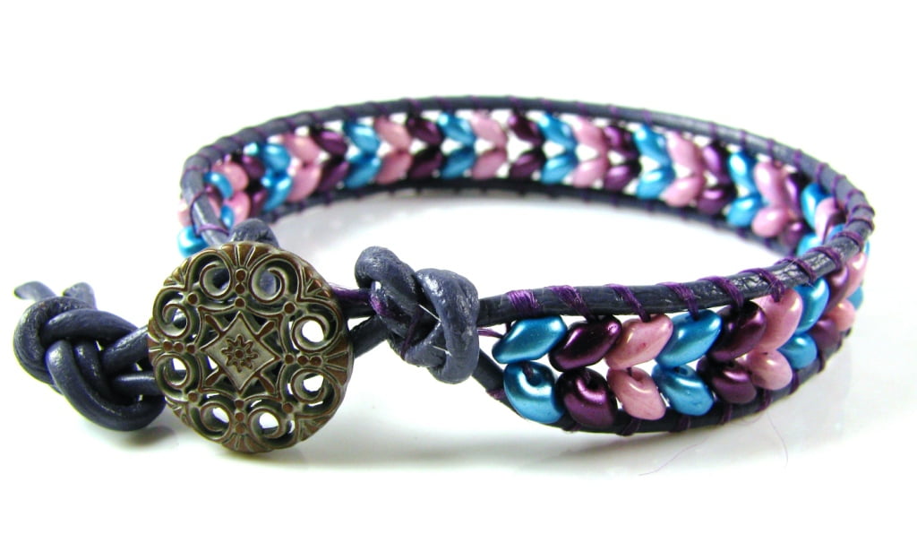 Step by step photographic tutorial showing you how to create a SuperDuo Herringbone Wrap bracelet using SuperDuo beads, Leather, S.